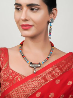 This elegant pendant necklace captures the divine essence of Indian spirituality through exquisite craftsmanship. The pendant features inspired by Shrinathji or Lord Krishna—rendered in glossy black with a richly detailed silver-tone crown. Studded with vibrant green and magenta stones and surrounded by brilliant white crystals, the design blends devotion with sophistication.