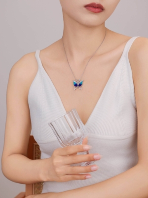 A delicate silver chain adorned with a beautifully crafted enamel butterfly pendant, symbolizing grace and transformation. Perfect for adding a touch of elegance to any outfit, this timeless piece combines artistry and sophistication effortlessly.